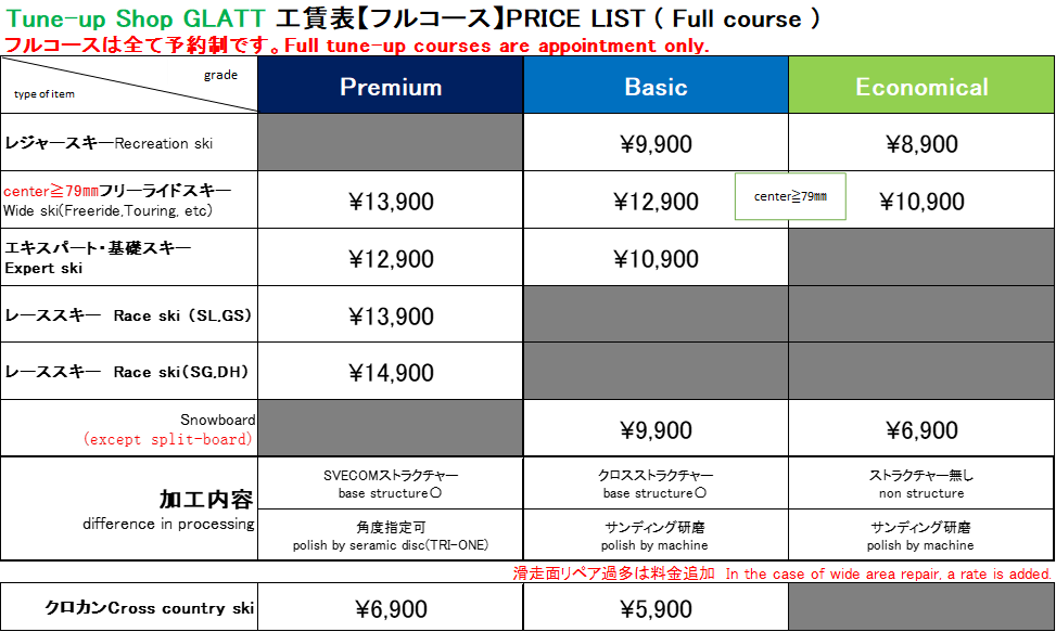One of the most popular servie is waxing !We select the most suitable wax according to the time, location and snow quality where you will be skiing.