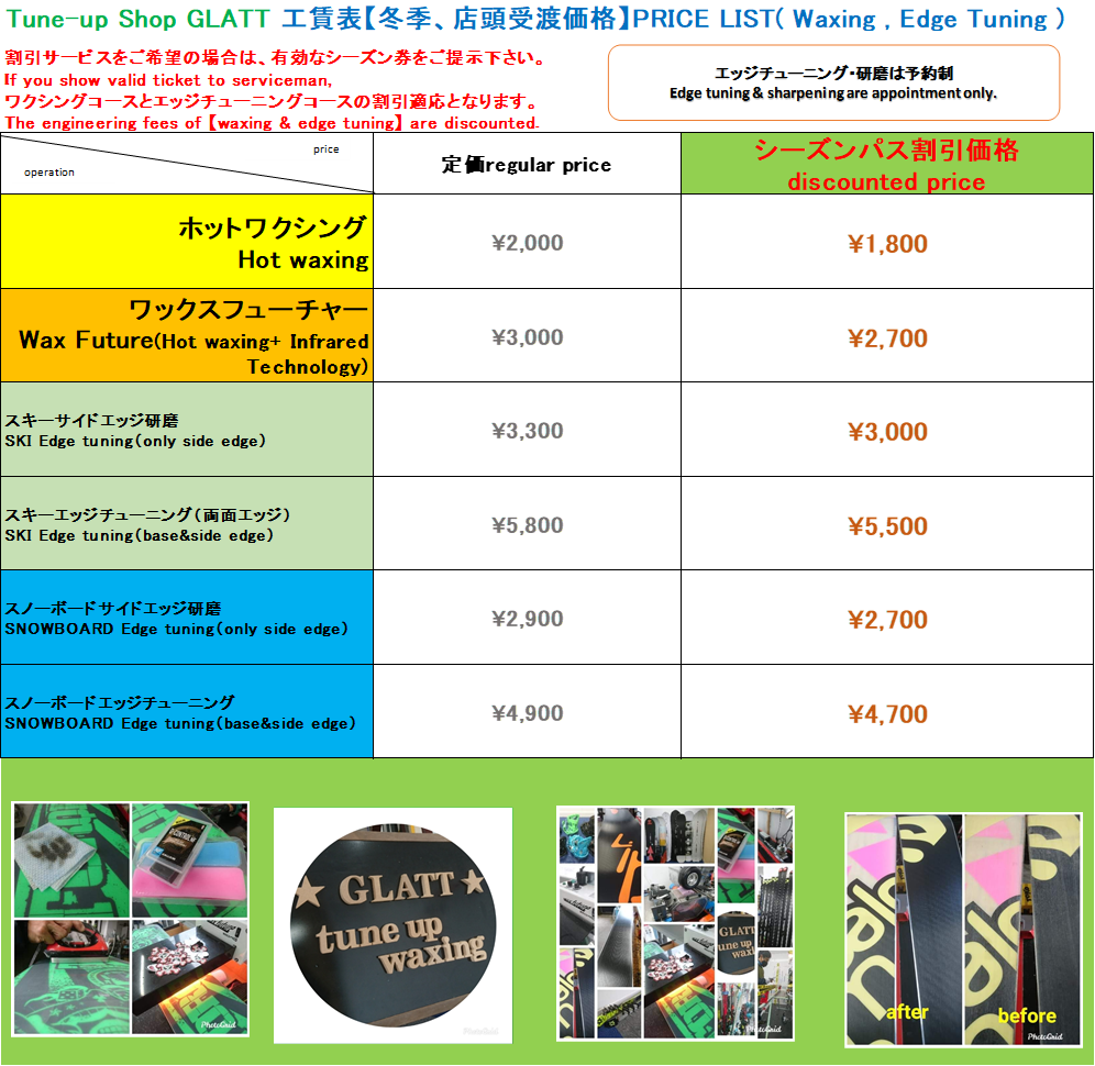 Tune-up shop GLATT is located on the ground floor of the Nagasaka centre building and provides professional level tune-up and waxing services for customers to fully enjoy the Nozawa Onsen Ski Resort, in any conditions.